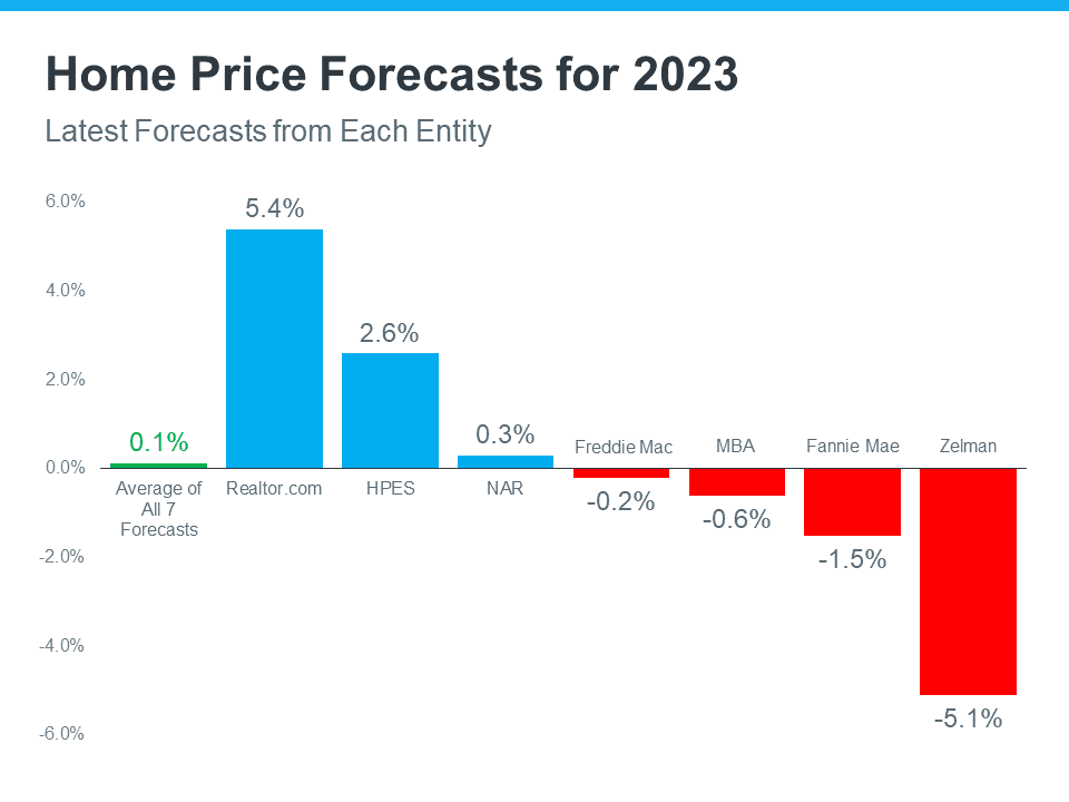 The graph below shows the latest home price forecasts for 2023. As the different colored bars indicate, some experts are saying home prices will appreciate this year, and others are saying home prices will come down. But again, if we take the average of all the forecasts (shown in green), we can get a feel for what 2023 may hold.