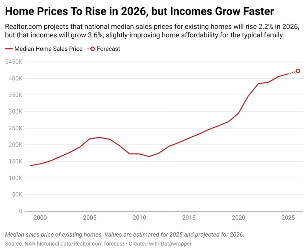 “After a challenging period for buyers, sellers, and renters, 2026 should offer a welcome, if modest, step toward a healthier housing market,” says Realtor.com Chief Economist Danielle Hale. “Incomes climbing faster than inflation as mortgage rates steady at a lower level create space for affordability to improve.”