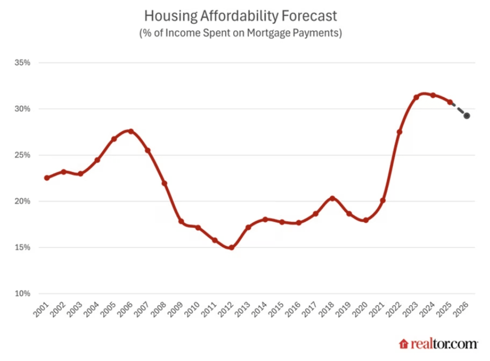 Mortgage rates will continue to average above 6% next year, but affordability will improve modestly as the typical monthly payment falls below 30% of a household’s income for the first time since 2022, the Realtor.com® economic research team predicts in its 2026 housing forecast.
