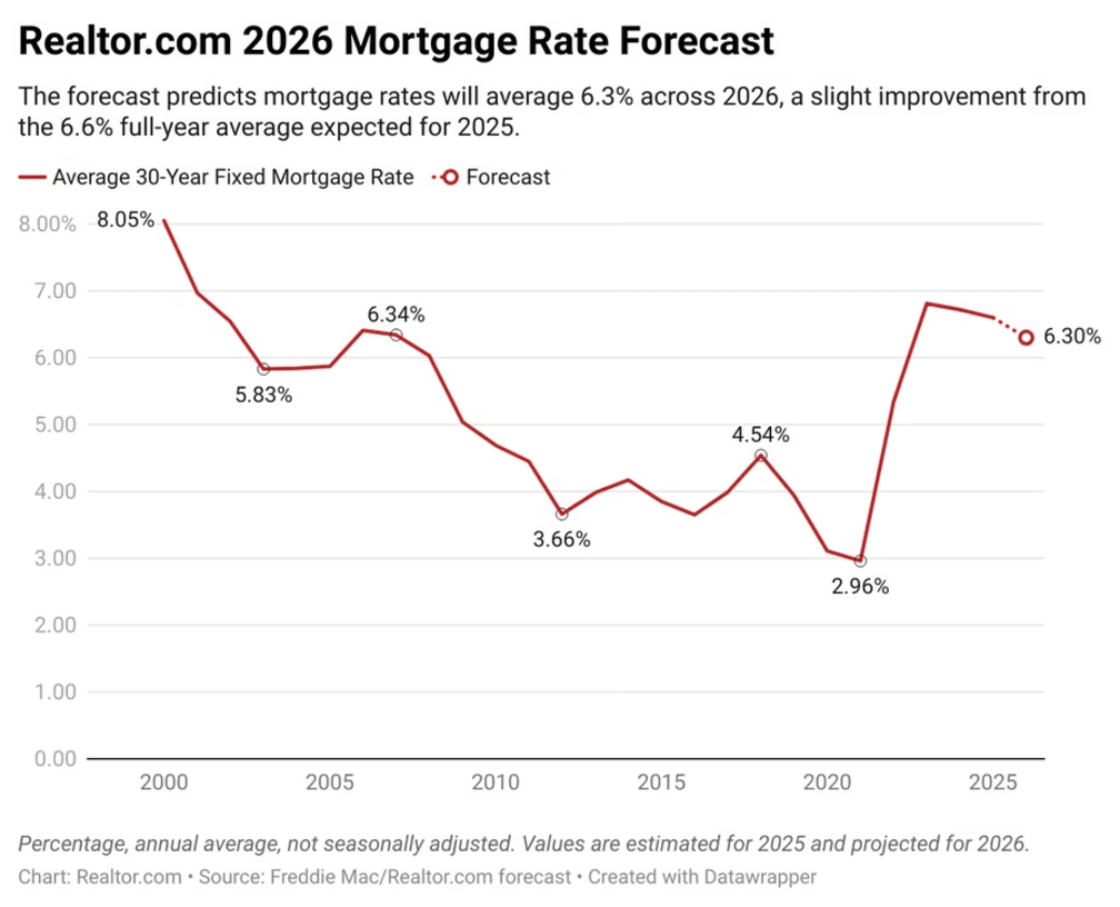 The forecast predicts mortgage rates will average 6.3% across 2026, a slight improvement from the 6.6% full-year average expected for 2025, but still well above the 4% historic average recorded from 2013 to 2019.