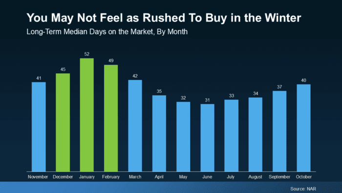 Homes tend to take a little longer to sell during this time of year. Data from the National Association of Realtors (NAR) shows the average time a house sits on the market jumps up during the winter months (see the green bars in the graph below):