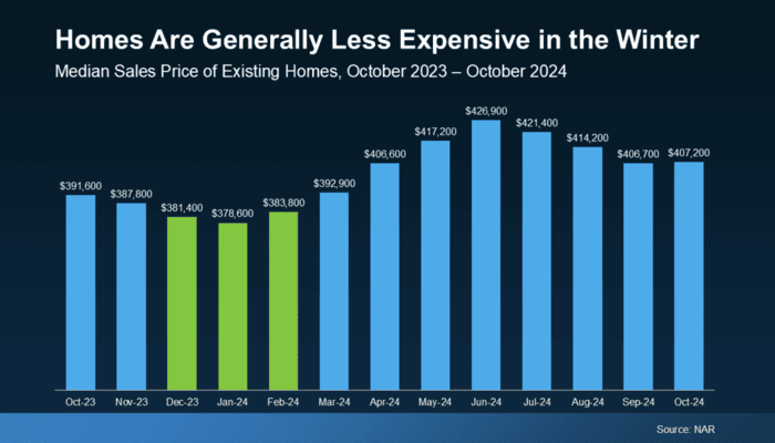 With less competition from other buyers and sellers who are more willing to negotiate, you may see slightly lower prices too. In fact, according to NAR, homes are typically about 5% less expensive now compared to when prices normally peak in the summer.
