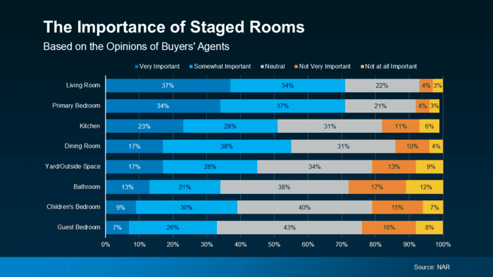 As you can see, agents who talk to buyers regularly agree, the most important spaces to stage are the rooms where buyers will spend the most time, like the living room, primary bedroom, and kitchen.